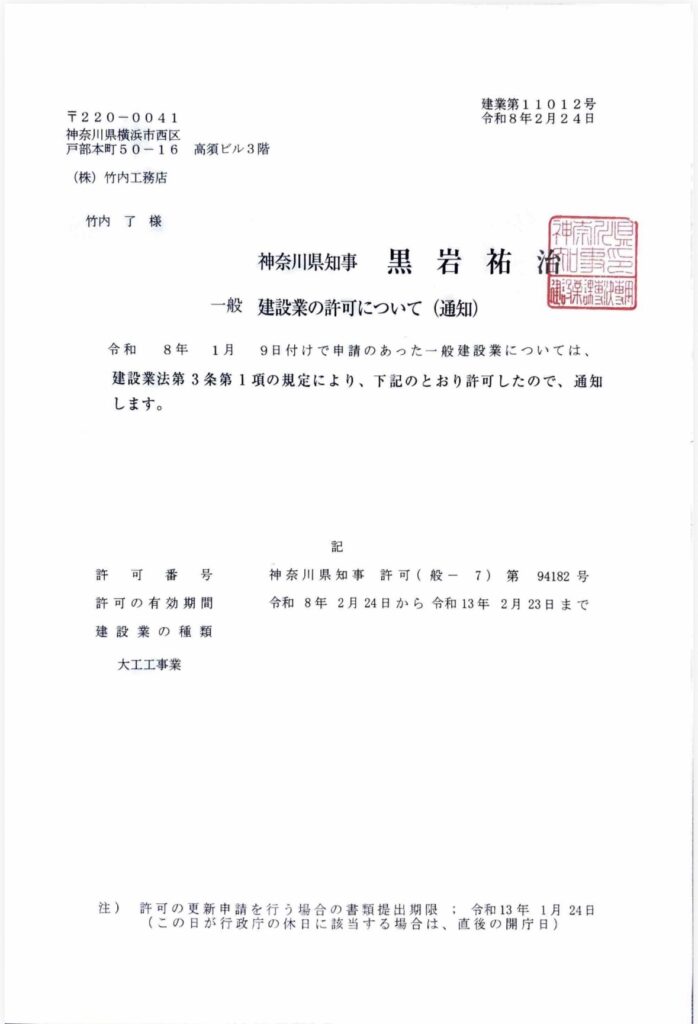 建設業の許可を下記のとおり取得いたしました。