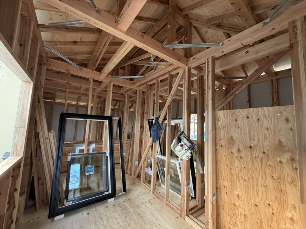 間柱筋交、構造金物、耐力面材が完了しました。